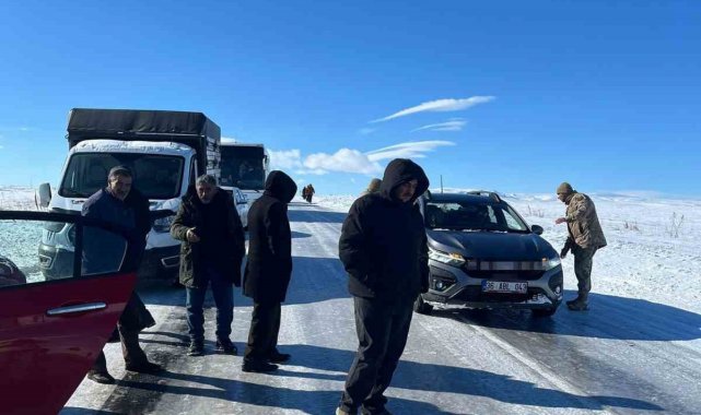 Eksi 30'a düşen sıcaklıklarda buz pistine dönen yolda araçlar mahsur kaldı