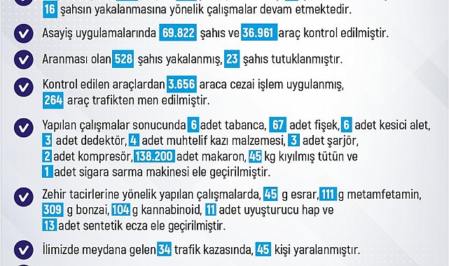 Yapılan çalışmalarda 6 adet tabanca, 67 adet fişek, 6 adet kesici alet, 3 adet dedektör, 4 adet muhtelif kazı malzemesi, 3 adet şarjör, 2 adet kompresör, 138 bin 200 adet makaron, 45 kilogram kıyılmış tütün ve 1 adet sigara sarma makinesi ele geçirildi. Zehir tacirlerine yönelik yapılan çalışmalarda ise 45 gram esrar, 111 gram metamfetamin, 309 gram bonzai, 104 gram kannabinoid, 11 adet uyuşturucu hap ve 13 adet sentetik ecza ele geçirildi. Kentte meydana gelen 34 trafik kazasında ise 45 kişinin yaralandığı bildirildi. Bu süre zarfında kaybolan 14 şahıs, 2 adet motosiklet ve 1 adet cep telefonunun bulunduğu aktarıldı.