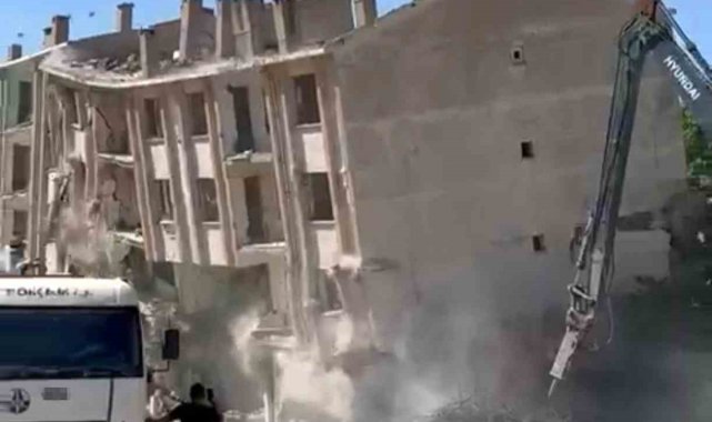 Kahramanmaraş'ta 6 Şubat 2023'te meydana gelen yıkıcı depremlerden etkilenen iller arasından bulunan Elazığ'da ağır hasarlı binaların yıkımı devam ediyor. Bu çerçevede, Abdullahpaşa Mahallesi'nde yıkımına başlanan 5 katlı 10 daireli bina, iş makinesinin makasını vurmasıyla bir anda yerle bir oldu. O anlar ise cep telefonu kamerası ile kaydedildi.