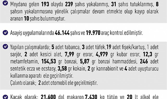 Yapılan çalışmalarda; 5 adet tabanca, 3 adet tüfek, 19 adet fişek/kartuş, 1 adet sarjör, 2 adet kesici alet, 7,99 gram esrar, 4,979 gram kubar esrar, 12,3 gram metamfetamin, 154,53 gram bonzai, 5,87 gram bonzai hammaddesi, 246 adet sentetik ecza ve ecstasy, 3,58 gram kokain, 2 gram kannabionit ve 4 adet uyuşturucu kullanma aparatı, çalıntı olarak 2 adet otomobil, kaçak olarak ise 21 bin 600 dal makaron, 7 bin 430 kilo tütün ve 20 litre alkol ele geçirildiği bildirildi.