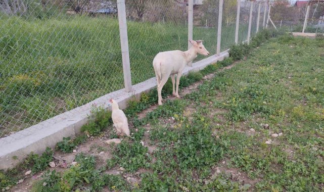 Elazığ'ın Ağın ilçesinde bembeyaz rengiyle dikkat çeken alageyik, doğal yaşam alanından bir evin bahçesine inerek ev sahibinin horozlarıyla vakit geçirdi. O anlar kameraya yansıdı.