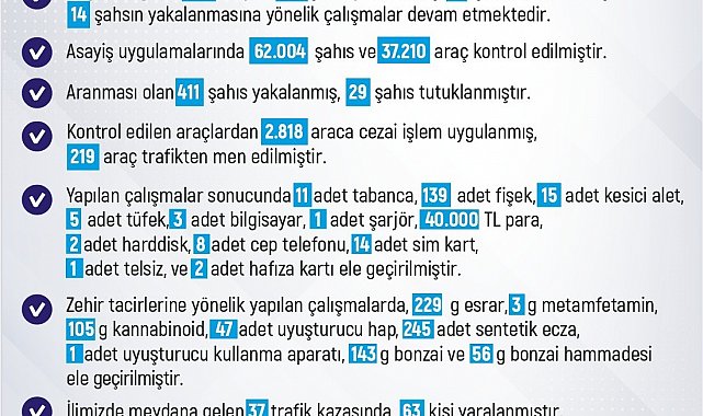 Zehir tacirlerine yönelik yapılan çalışmalarda, 229 gram esrar, 3 gram metamfetamin, 105 gram kannabinoid, 47 adet uyuşturucu hap, 245 adet sentetik ecza, 1 adet uyuşturucu kullanma aparatı, 143 gram bonzai ve 56 gram bonzai hammadesi ele geçirildi. Ayrıca kentte meydana gelen 37 trafik kazasında 63 kişi yaralandı.