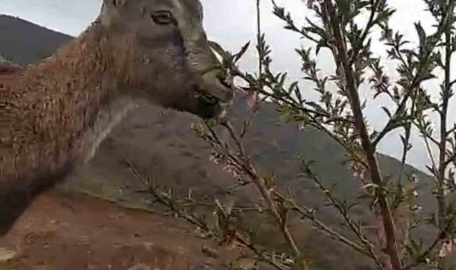 Elazığ'ın Palu ilçesine bağlı Arındık köyünde bir dağ keçisi, evin duvarına tırmanarak ağaç dallarını yemeye başladı. O anlar, köy korucusu Engin Yamanoğlu tarafından cep telefonu kamerasıyla kaydedildi. Dağ keçisinin rahat tavırlarla dalları yemesi izleyenlerin ilgisini çekti.