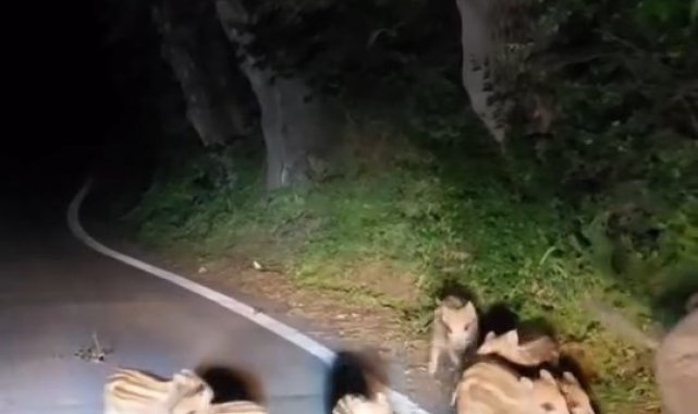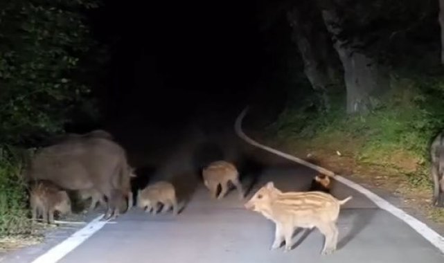 Elazığ'ın Sivrice ilçesinde domuzlar ve yavruları köy yoluna indi. Domuz ve yavruları, aracın gelişine aldırış etmezken, sürücü bir süre beklemek zorunda kaldı. Domuzlar bir süre sonra ormanlık alana giderek gözden kaybolurken sürücü ise yoluna devam etti. O anlar cep telefonu kamerasına yansıdı.
