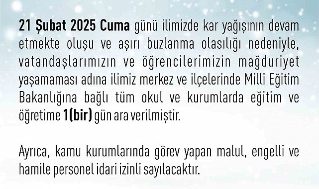 Elazığ'da dün gece saatlerinde başlayan ve etkisini sürdüren kar yağışından dolayı bugün eğitim ve öğretime ara verilmişti. Kar yağışının devam etmesi ve hava sıcaklıklarının eksinin altında seyretmesi nedeniyle eğitime 1 gün daha ara verildi. Elazığ Valiliği tarafından yapılan açıklamada, "21 Şubat 2025 Cuma günü karın ilimizde devam etmekte oluşu, aşırı buzlanma ihtimali nedeniyle vatandaşlarımızın ve öğrencilerimizin mağduriyet yaşamaması için ilimiz merkez ve ilçelerinde Milli Eğitim Bakanlığı'na bağlı tüm okul ve kurumlarda eğitim ve öğretime 1 gün ara verilmiştir. Ayrıca kamu kurumlarında görev yapan malul engelli ve hamile personel idari izinli sayılacaktır" denildi.