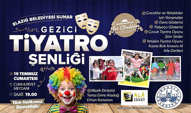Elazığ Belediyesi, yaz aylarında vatandaşların kültürel etkinliklere katılımını artırmak ve şehrin sosyal yaşamına canlılık kazandırmak amacıyla faaliyetlerini sürdürüyor. Elazığ Belediyesi yaz etkinlikleri kapsamında kent genelinde gerçekleştirilen gezici tiyatro şenliği bu hafta Cumhuriyet Meydanında her yaştan Elazığlıya hitap eden zengin içeriğiyle sahne alacak. Program, 19 Temmuz Cumartesi günü saat 19.00'da başlayacak.