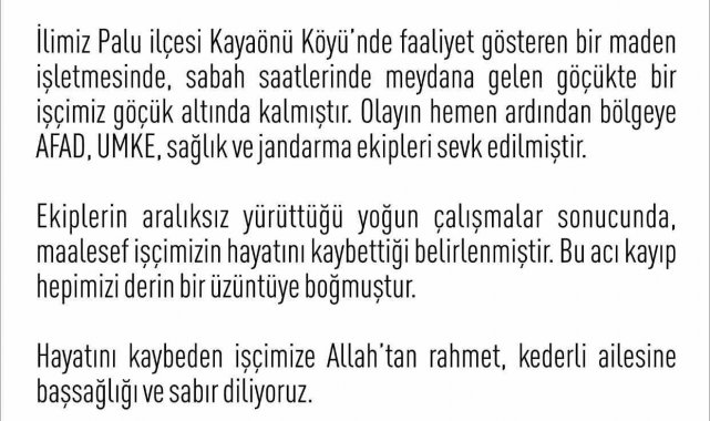 Edinilen bilgiye göre, Alacakaya ilçesi Kayaönü mevkiinde saat 09:30'da Polay Madencilik'in işlettiği krom ocağında göçük meydana geldi. 4 işçiden 3'ü kendi imkanlarıyla çıkarken biri ise göçük altında kaldı. Haber verilmesi üzerine olay yerine AFAD, UMKE, jandarma ve sağlık ekipleri sevk edildi. Ekipler 7 saatlik çalışmanın ardından Hasan Coşkun'un (45) cansız bedenini ulaşıldı. İşçinin cansız bedeninin çıkarılması için çalışmaların sürdüğü bildirildi.