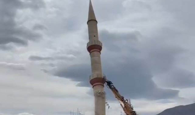 Elazığ'da hasarlı caminin minaresi iş makinesi ile yıkıldı