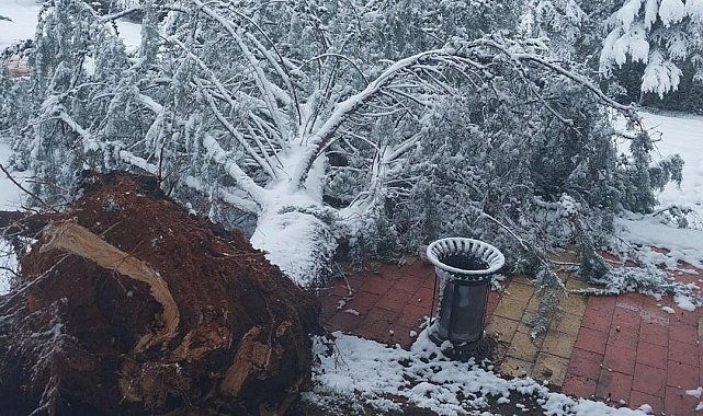 Elazığ'da kar yağışı sonrasında ağırlığa dayanamayan bir ağaç devrildi.