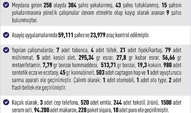 Yapılan çalışmalarda, 7 adet tabanca, 4 adet tüfek, 21 adet fişek/kartuş, 79 adet mühimmat, 5 adet kesici alet, 295,34 gram esrar, 27,8 gram kubar esrar, 56,66 gram metamfetamin, 7,79 gram bonzai hammaddesi, 513,71 gram bonzai, 19,3 kokain, 980 adet sentetik ecza ve ecstasy, 45 gram kannabinoit, 503 adet captagon hap ve 1 adet uyuşturucu sarma aparatı ele geçirilmiştir. Çalıntı olarak; 1 adet otomobil, 1 adet oto type, 2 adet flash bellek ele geçirildi. Kaçak olarak 3 adet cep telefonu, 520 adet emtia, 244 adet tekstil ürünü, bin 500 adet serum seti, 94 bin 200 adet makaron, 228 paket sigara, 10 adet puro ele geçirildi.