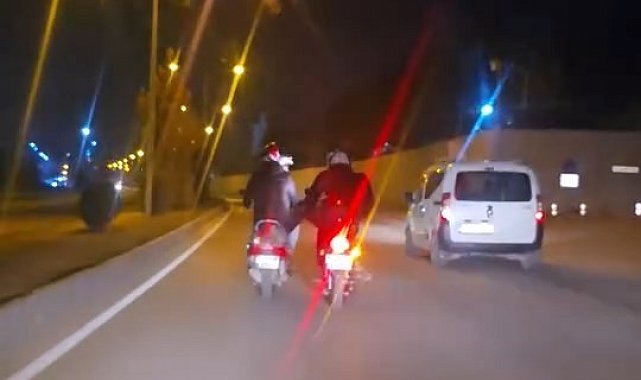 Olay, merkez Atatürk Bulvarı'nda meydana geldi. Edinilen bilgiye göre, plakası tespit edilemeyen bir motosiklet sürücüsü, seyir halinde olan başka bir motosikleti ayağı ile ittirerek ilerletti. Motosikletin ayakla ittirilerek ilerlemesine tanık olan vatandaşlar, şaşkınlıklarını gizleyemedi. İki motosiklet sürücüsü, bu davranışlarıyla trafikte kazaya davetiye çıkardı.