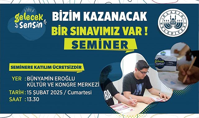 Bir eğitim kurumu iş birliği ile gerçekleştirilecek 'Bizim Kazanacak Bir Sınavımız Var' temalı seminer, 15 Şubat Cumartesi günü saat 13.30'da Elazığ Belediyesi Bünyamin Eroğlu Kültür ve Kongre Merkezi'nde gerçekleştirilecek ve tüm öğrenciler ücretsiz olarak katılabilecek.
