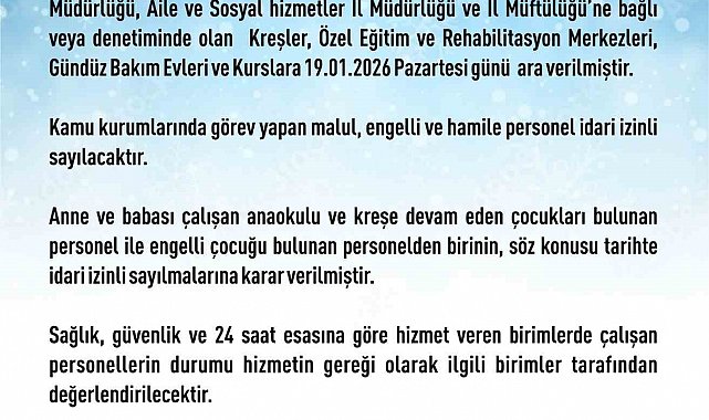 Elazığ Valiliği'nden yapılan açıklamada, "Yoğun kar yağışı ve buzlanma nedeniyle ilimiz merkezinde Milli Eğitim Müdürlüğü, Aile ve Sosyal hizmetler İl Müdürlüğü ve İl Müftülüğü'ne bağlı veya denetiminde olan kreşler, özel eğitim ve rehabilitasyon merkezleri, gündüz bakım evleri ve kurslara Pazartesi günü ara verilmiştir. Kamu kurumlarında görev yapan malul, engelli ve hamile personel idari izinli sayılacaktır. Anne ve babası çalışan anaokulu ve kreşe devam eden çocukları bulunan personel ile engelli çocuğu bulunan personelden birinin, söz konusu tarihte idari izinli sayılmalarına karar verilmiştir. Sağlık, güvenlik ve 24 saat esasına göre hizmet veren birimlerde çalışan personellerin durumu hizmetin gereği olarak ilgili birimler tarafından değerlendirilecek. İlçelerde ise Kaymakamlar tarafından karar verilecektir" denildi.