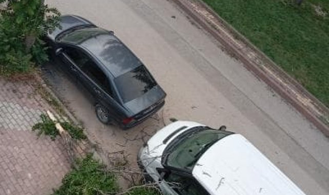 Elazığ'da şiddetli fırtınanın etkisiyle çöp konteyneri yolun karşı tarafına savrulurken, ağaçların dalları da kırıldı. O anlar araç kamerasına yansıdı.