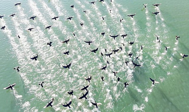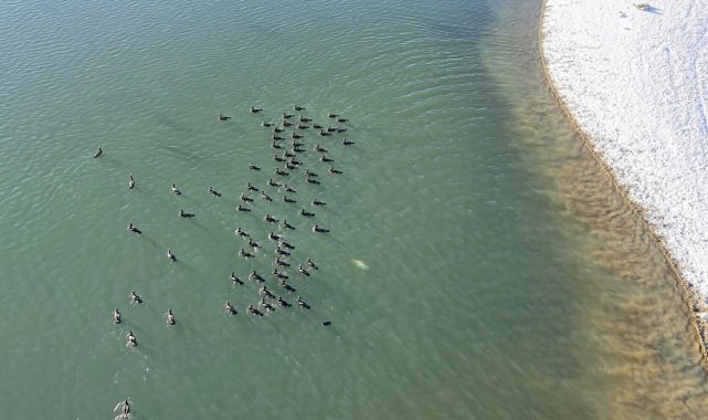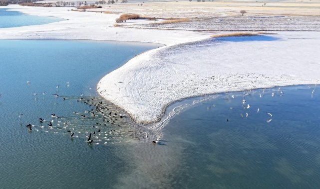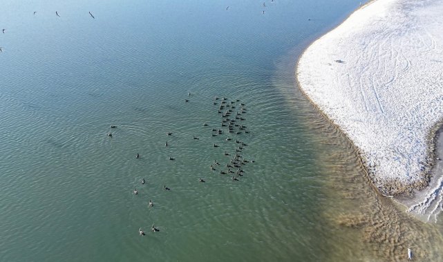 Elazığ'da etkisini sürdüren soğuk hava ve kar yağışı, Cip Baraj Gölü'nde yaban hayatına dair kartpostallık görüntüler ortaya çıkardı. Kara batakların su üzerinde ilerleyip gökyüzüne yükseldiği anlar dron ile kaydedildi.