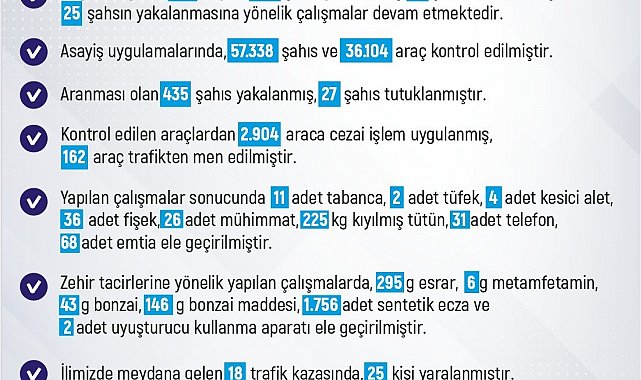 Elazığ'da 13-19 Ocak tarihleri arasında meydana gelen 195 olayda 191 şahıs yakalandı, 12 şahıs tutuklanarak cezaevine gönderilirken 25 şahsın yakalanmasına yönelik çalışmaların devam ettiği belirtildi. Asayiş uygulamalarında ise 57 bin 338 şahıs ve 36 bin 104 araç kontrol edildi. 435 kişi yakalanırken 27'si tutuklanarak cezaevine gönderildi. Kontrol edilen araçlardan 2 bin 904 araca cezai işlem uygulanırken 162 araç trafikten men edildi. Yapılan çalışmalar sonucunda 11 adet tabanca, 2 adet tüfek, 4 adet kesici alet 36 adet fişek, 26 adet mühimmat, 225 kilo kıyılmış tütün, 31 adet telefon, 68 adet emtia ele geçirildi. Zehir tacirlerine yönelik yapılan çalışmalarda, 295 gram esrar, 6 gram bonzai, 146 gram bonzai maddesi, bin 756 adet sentetik ecza ve 2 adet uyuşturucu kullanma aparatı ele geçirildi. Kentte meydana gelen 18 trafik kazasında 25 kişi yaralanırken, kaybolan 13 kişi ise bulundu. Öte yandan, 1 otomobil, 1 telefon ve 1 adet çanta ile pasaport da bulundu.