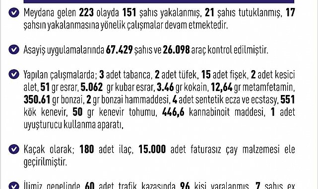 Elazığ Valiliği, 14-21 Temmuz tarihlerinde meydana gelen haftalık asayiş olaylarını açıkladı. Buna göre, son bir haftada 223 olay meydana gelirken 151 şahıs yakalandı. 21 şahsın tutuklandığı, 17 kişiyi yakalama çalışmalarının devam ettiği belirtildi. Çalışmalarda 67 bin 429 şahıs ve 26 bin 98 araç denetlendi. Kontrol edilen 13 bin 327 araçtan 2 bin 532'sine cezai işlem uygulanırken 168 araç da trafikten men edildi. Yapılan çalışmalarda, 3 tabanca, 2 tüfek, 15 adet fişek, 2 adet kesici alet, 51 gram esrar, 5 bin 62 gram kubar esrar, 3.46 gram kokain, 12,64 gram metamfetamin, 350.61 gram bonzai, 2 gram bonzai ham maddesi, 4 adet sentetik ecza ve ecstasy, 551 kök kenevir, 50 gram kenevir tohumu, 446,6 kannabinoit maddesi, 1 adet uyuşturucu kullanma aparatı, 180 adet kaçak ilaç, 15 bin adet faturasız çay malzemesi ele geçirildi.