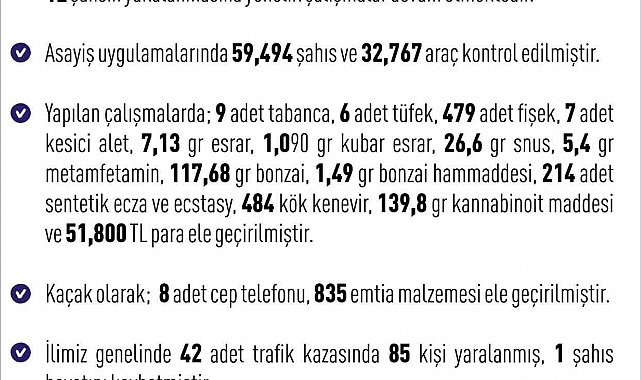 Yapılan çalışmalarda 9 adet tabanca, 6 adet tüfek, 479 adet fişek, 7 adet kesici alet, 7,13 gram esrar, 1,090 gram kubar esrar, 26,6 gram snus, 5,4 gram metamfetamin, 117,68 gram bonzai, 1,49 gram bonzai hammaddesi, 214 adet sentetik ecza ve extacy, 484 kök kenevir, 139,8 gram kannabinoit maddesi ve 51 bin 800 lira para ele geçirildi. Kaçak olarak, 8 adet cep telefonu, 835 emtia malzemesi ele geçirildi. Kent genelinde 42 adet trafik kazasında 85 kişi yaralanırken 1 kişi de hayatını kaybetti.