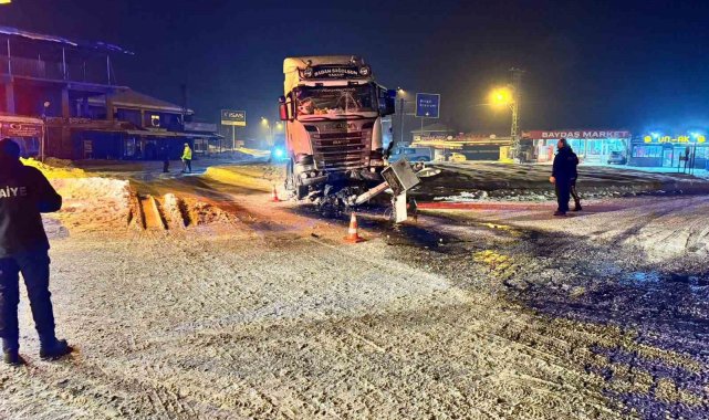 Elazığ'da kar ve buzlanmadan dolayı kayan tır, kavşaktaki refüje çıkarak KGYS direğine çarptı. Kazada 1 kişi yaralandı.