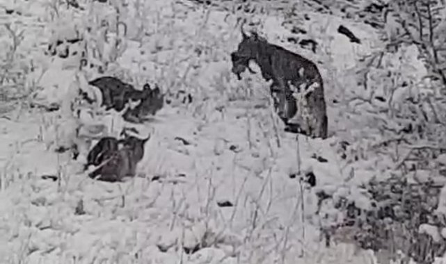 Elazığ'da avladığı kekliği yiyen vaşak ailesi kameralara yansıdı.