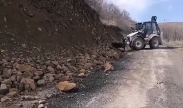 Elazığ'da etkili olan yağışlarla birlikte köy yoluna düşen kaya parçaları, ekipler tarafından kaldırıldı.