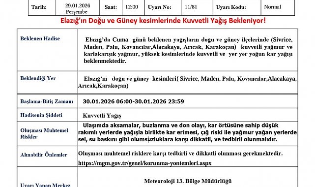 Meteoroloji 13. Bölge Müdürlüğü'nden yapılan uyarıda, "Elazığ'da Cuma günü beklenen yağışların doğu ve güney ilçelerinde (Sivrice, Maden, Palu, Kovancılar,Alacakaya, Arıcak, Karakoçan) kuvvetli yağmur ve karlakarışık yağmur, yüksek kesimlerinde kuvvetli ve yer yer yoğun kar yağışı beklenmektedir. Ulaşımda aksamalar, buzlanma ve don olayı, kar örtüsüne sahip düşük rakımlı yerlerde yağışla birlikte kar erimesi, çığ riski ile yağmur yağan yerlerde sel, su baskını gibi olumsuzluklara karşı dikkatli, ve tedbirli olunmalıdır" denildi.
