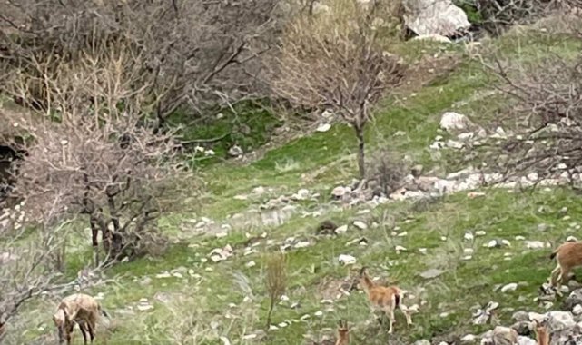 Elazığ'ın Harput Mahallesi'ndeki kayalık alanlarda ortaya çıkan dağ keçileri, vatandaşların dikkatini çekti. Tarihi dokusuyla bilinen Harput'ta sürü halinde görüntülenen dağ keçileri, kısa sürede gözden kayboldu.