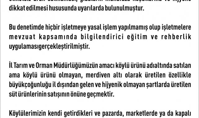 Elazığ Valiliği'nden yapılan açıklamada, "İlimizde yürütülen gıda denetimleri; vatandaşlarımızın güvenilir ve sağlıklı gıdaya ulaşmasını sağlamak amacıyla ilgili kurumlarımız tarafından mevzuat çerçevesinde düzenli olarak sürdürülmektedir. Bu kapsamda gerçekleştirilen denetimlerin amacı herhangi bir kesimi mağdur etmek değil; halk sağlığını korumak, güvenilir gıda arzını temin etmek ve kayıt dışı üretimin önüne geçmektir. İl Tarım ve Orman Müdürlüğümüzce 5996 sayılı Veteriner Hizmetleri, Bitki Sağılığı, Gıda ve Yem Kanunu kapsamında, yıl boyunca titizlikle yürütülen gıda denetim faaliyetlerimiz Ramazan ayı boyunca arttırılmıştır. Cumhurbaşkanlığı İletişim Merkezi(CİMER)' ne yapılan şikayete istinaden halkımızın alışveriş için yoğun talep gösterdiği kapalı çarşıda 11.03.2026 tarihinde İl Tarım ve Orman Müdürlüğü tarafından denetim gerçekleştirilmiştir. Vatandaşlarımızın güvenilir gıda tüketmesi adına kapalı çarşı esnafına etiketsiz ürün satmaması, gıdaların muhafaza koşullarına ve hijyene dikkat edilmesi hususunda uyarılarda bulunulmuştur. Bu denetimde hiçbir işletmeye yasal işlem yapılmamış olup işletmelere mevzuat kapsamında bilgilendirici eğitim ve rehberlik uygulaması gerçekleştirilmiştir. İl Tarım ve Orman Müdürlüğümüzün amacı köylü ürünü adı altında satılan ama köylü ürünü olmayan, merdiven altı olarak üretilen özellikle büyük çoğunluğu il dışından gelen ve hijyenik olmayan şartlarda üretilen süt ürünlerinin satışının önüne geçmektir. Köylülerimizin kendi getirdikleri ve pazarda, marketlerde ya da kapalı çarşıda satılan ürünlere hiç bir işlem yapılmamaktadır" denildi.