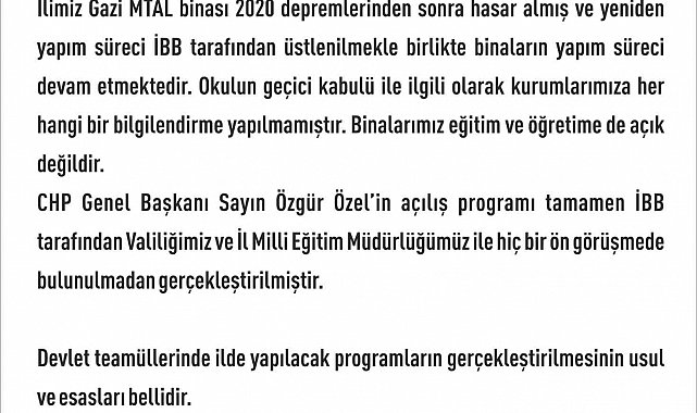Açılış sonrası Elazığ Valiliği'nce yapılan açıklamada, "İlimiz Gazi MTAL binası 2020 depremlerinden sonra hasar almış ve yeniden yapım süreci İBB tarafından üstlenilmekle birlikte binaların yapım süreci devam etmektedir. Okulun geçici kabulü ile ilgili olarak kurumlarımıza herhangi bir bilgilendirme yapılmamıştır. Binalarımız eğitim ve öğretime de açık değildir. CHP Genel Başkanı Sayın Özgür Özel'in açılış programı tamamen İBB tarafından, Valiliğimiz ve İl Milli Eğitim Müdürlüğümüz ile hiçbir ön görüşmede bulunulmadan gerçekleştirilmiştir. Devlet teamüllerinde ilde yapılacak programların gerçekleştirilmesinin usul ve esasları bellidir" denildi.