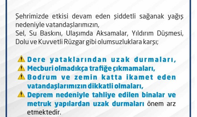 Elazığ Valiliği'nden yapılan açıklamada, "Şehrimizde etkisi devam eden şiddetli sağanak yağış nedeniyle vatandaşlarımızın, sel, su, baskını, ulaşımda aksamalar, yıldırım düşmesi, dolu ve kuvvetli rüzgar gibi olumsuzluklara karşı, dere yataklarından uzak durmaları, mecburi olmadıkça trafiğe çıkmamaları, bodrum ve zemin katta ikamet eden vatandaşlarımızın dikkatli olmaları, deprem nedeniyle tahliye edilen binalar ve metruk yapılardan uzak durmaları önem arz etmektedir" denildi.