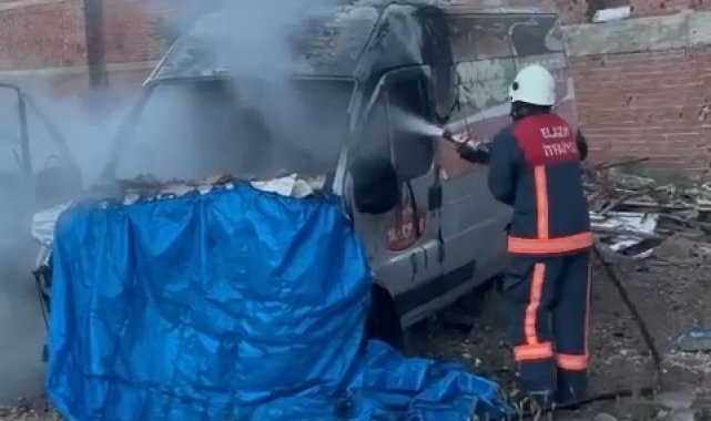 Elazığ'da park halindeyken bir anda alev alan transit araç, kullanılama...