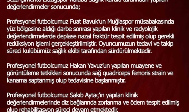 Elazığspor sağlık heyetinden yapılan yazılı açıklamada; "Profesyonel futbolcumuz Fuat Bavuk'un Muğlaspor müsabakasında yüz bölgesine aldığı darbe sonrası yapılan klinik ve radyolojik değerlendirmelerde deplase nazal fraktür tespit edilmiş olup gerekli redüksiyon işlemi gerçekleştirilmiştir. Oyuncumuzun tedavi ve takip süreci kulübümüz sağlık ekibi tarafından sürdürülmektedir. Profesyonel futbolcumuz Hakan Yavuz'un yapılan muayene ve görüntüleme tetkikleri sonucunda sağ quadriceps femoris strain ve kanama saptanmış olup tedavisine başlanmıştır. Profesyonel futbolcumuz Sakıb Aytaç'ın yapılan klinik değerlendirmelerinde diz bağlarında zorlanma ve ödem tespit edilmiş olup rehabilitasyon süreci devam etmektedir. Söz konusu üç futbolcumuz, devam eden tedavi süreçleri nedeniyle Sincan Belediyesi Ankaraspor ile oynanacak müsabakanın maç kadrosunda yer alamayacaktır" denildi.