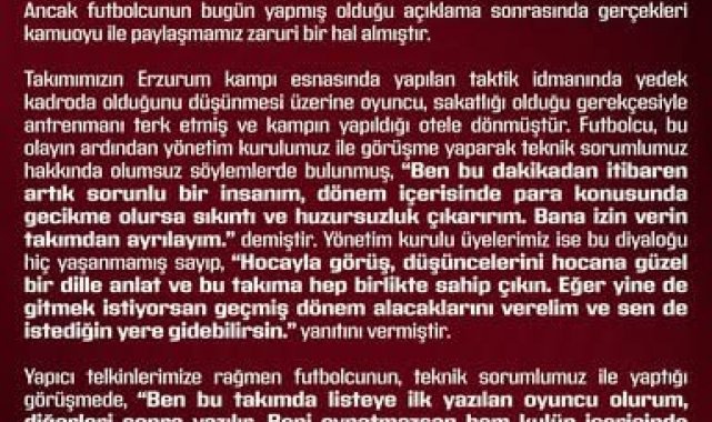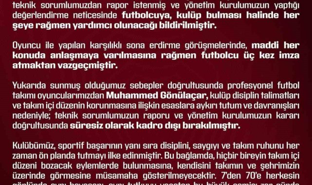 Açıklamada, "Oyuncu ile yapılan karşılıklı sona erdirme görüşmelerinde, maddi her konuda anlaşmaya varılmasına rağmen futbolcu üç kez imza atmaktan vazgeçmiştir. Sunmuş olduğumuz sebepler doğrultusunda profesyonel futbol takımı oyuncularımızdan Muhammed Gönülaçar, kulüp disiplin talimatları ve takım içi düzenin korunmasına ilişkin esaslara aykırı tutum ve davranışları nedeniyle; teknik sorumlumuzun raporu ve yönetim kurulumuzun kararı doğrultusunda süresiz olarak kadro dışı bırakılmıştır. Kulübümüz, sportif başarının yanı sıra disiplini, saygıyı ve takım ruhunu her zaman ön planda tutmayı ilke edinmiştir. Bu bağlamda, hiçbir bireyin takım içi düzeni bozacak eylemlerde bulunmasına, kendisini takımın ve şehrimizin üzerinde görmesine müsamaha gösterilmeyecektir. 7'den 70'e herkesin gönlünde aynı heyecanı, aynı tutkuyu yaşatan bu büyük camia; zor günde kenetlenen, sevinçte coşan, hüzünde tek yürek olan bir şehrin simgesidir. Elazığspor, yalnızca sahada değil, her evde, her sokakta, her yürekte var olan koca bir sevdadır. Bu büyüklüğü anlamayanlar bilsin ki; Elazığ'da herkesin ortak paydası Elazığspor'dur" ifadelerine yer verildi.
