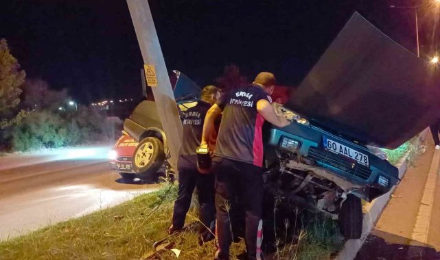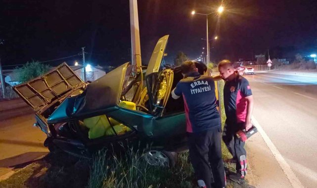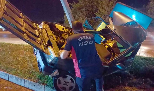 Tokat'ın Erbaa ilçesinde meydana gelen trafik kazasında, refüje çıkan otomobil aydınlatma direğine çarparak hurdaya döndü.