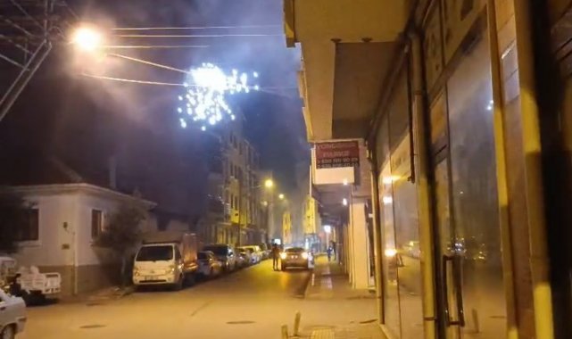 Bursa'da kısa devre yapan elektrik tellerinden çıkan kıvılcımlar, sokağı aydınlattı.
