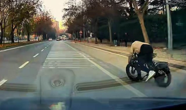 Yaşananlar ise caddede seyir halinde olan bir otomobilin araç kamerasına anbean yaşadı. Görüntüde elleri cebinde giden bisikletlinin dengesini kaybederek yola savrulması, otomobil sürücüsünün hızlı manevrası ile yanından geçmesi, daha sonra bisikletlinin toparlanarak kalkması ve caddeden gelen araçlar görülüyor.