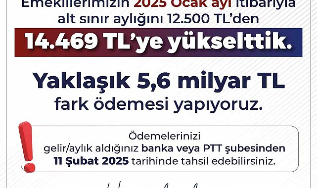 SGK, emeklilerin zam farkı ödemelerinin yarın hesaplara yatırılacağını bildirdi. Konuya ilişkin yapılan açıklamada, "Emeklilerimize ve hak sahiplerine fark tutarlarını ödüyoruz. Emeklilerimizin 2025 Ocak ayı itibarıyla alt sınır aylığını 12 bin 500 TL'den 14 bin 469 TL'ye yükselttik. Yaklaşık 5,6 milyar TL fark ödemesi yapıyoruz. Ödemelerinizi gelir/aylık aldığınız banka veya PTT şubesinden 11 Şubat tarihinde tahsil edebilirsiniz" ifadelerine yer verildi.