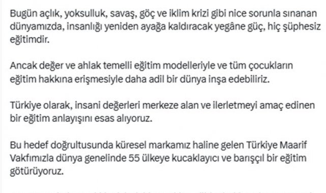 "İnsanlığın ortak geleceğine katkı sunan bu anlamlı zirvenin, yeni başlangıçların vesilesi olmasını diliyorum. Bugün açlık, yoksulluk, savaş, göç ve iklim krizi gibi nice sorunla sınanan dünyamızda, insanlığı yeniden ayağa kaldıracak yegane güç, hiç şüphesiz eğitimdir. Ancak değer ve ahlak temelli eğitim modelleriyle ve tüm çocukların eğitim hakkına erişmesiyle daha adil bir dünya inşa edebiliriz. Türkiye olarak, insani değerleri merkeze alan ve ilerletmeyi amaç edinen bir eğitim anlayışını esas alıyoruz. Bu hedef doğrultusunda küresel markamız haline gelen Türkiye Maarif Vakfımızla dünya genelinde 55 ülkeye kucaklayıcı ve barışçıl bir eğitim götürüyoruz. Amacımız, imkansızlıklar içindeki çocukları eğitim hakkına kavuşturarak geleceğin dünyasında eşit şartlarda yer alabilmelerini sağlamak. Çünkü, meyveleri nesiller boyunca toplanacak bir dönüşümü ancak böyle başlatabiliriz. Programda emeği geçen herkese teşekkür ediyor, tüm insani krizlerin son bulduğu müreffeh yarınlarda buluşmayı diliyorum."