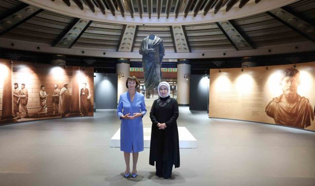 Lider eşleri daha sonra Cumhuriyet tarihinin en kapsamlı arkeoloji projesi "Geleceğe Miras" kazılarıyla bulunan eserlerin yer aldığı "Arkeolojinin Altın Çağı Sergisi"ni gezdi. Burdur'daki Boubon Antik Kenti'nde 1960'lı yıllarda yapılan kaçak kazılar sonucu yurt dışına çıkarılan ve 65 yıl aradan sonra Türkiye'ye getirilen, MS 2. ve 3. yüzyıllara tarihlenen Roma İmparatoru Marcus Aurelius bronz heykelin de yer aldığı sergiyi ilgiyle gezen Emine Erdoğan ve Charlotte Merz, eserler hakkında bilgi aldı. Lider eşleri, kütüphane ziyaretinin ardından Devlet Konukevi'ne geçerek burada ikili görüşme gerçekleştirdi.