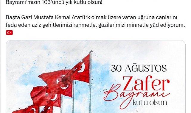 Emine Erdoğan, 30 Ağustos Zafer Bayramı dolayısıyla NSosyal hesabından paylaştığı mesajında, "İstiklal mücadelemizi şan ve şerefle taçlandıran 30 Ağustos Zafer Bayramı'mızın 103'üncü yılı kutlu olsun. Başta Gazi Mustafa Kemal Atatürk olmak üzere vatan uğruna canlarını feda eden aziz şehitlerimizi rahmetle, gazilerimizi minnetle yad ediyorum" ifadelerini kullandı.