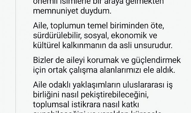 "Bizler de aileyi korumak ve güçlendirmek için ortak çalışma alanlarımızı ele aldık. Aile odaklı yaklaşımların uluslararası işbirliğini nasıl pekiştirebileceğini, toplumsal istikrara nasıl katkı sunabileceğini ve yerelden küresele dönüştürücü bir güç olarak nasıl rol oynayabileceğini değerlendirdik. Zira biliyoruz ki aile, değerlerin taşıyıcısı, çocuklarımız için en güvenli sığınak ve insanlığın yarınıdır. Krizlerin, çatışmaların ve afetlerin gölgesinde bize yol gösteren hakikat, dayanışmanın aileden başladığıdır. Türkiye olarak, barışa, adalete ve ortak refaha giden yolun aileden geçtiğine inanıyoruz. Öyle ki aileyi koruyabildiğimiz ölçüde, daha adil, daha huzurlu ve daha müreffeh bir dünya inşa edebiliriz. Bu doğrultuda belirtilen her görüş ve önerinin, aile kurumunu koruma yolunda, küresel ölçekte atılacak adımlara ilham olacağına yürekten inanıyorum."