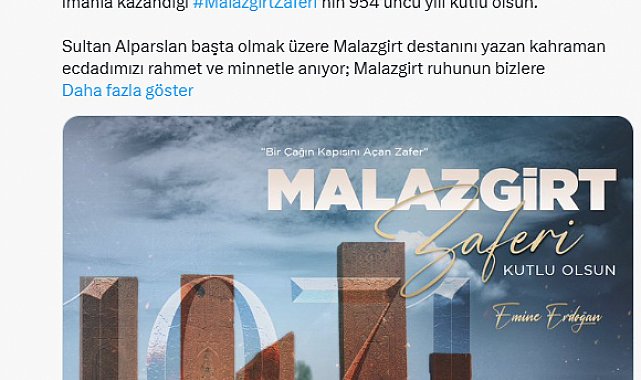 Emine Erdoğan, NSosyal hesabından yaptığı paylaşımda, "Tarihimizin en önemli dönüm noktalarından birisi olan, milletimizin azim ve imanla kazandığı Malazgirt Zaferi'nin 954'üncü yılı kutlu olsun. Sultan Alparslan başta olmak üzere Malazgirt destanını yazan kahraman ecdadımızı rahmet ve minnetle anıyor, Malazgirt ruhunun bizlere daima güç vermesini diliyorum" ifadelerini kullandı.