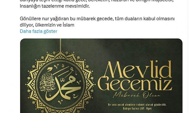 "Alemlere rahmet olarak gönderilen Hazreti Peygamberimizin (S.A.V) dünyaya teşrif ettiği kutlu gece, bereketin, huzurun ve birliğin müjdecisi, insanlığın tazelenme mevsimidir. Gönüllere nur yağdıran bu mübarek gecede, tüm duaların kabul olmasını diliyor, ülkemizin ve İslam dünyasının Leyle-i Mevlidi'ni tebrik ediyorum."