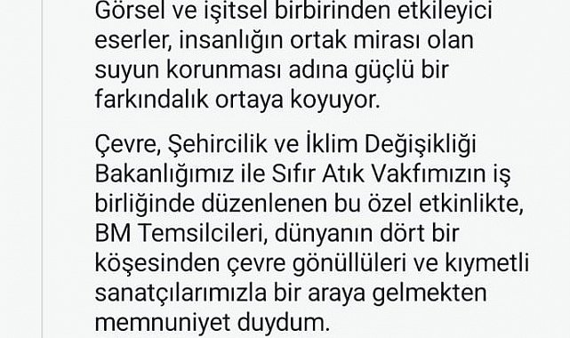 "2019 yılında 'Su, ortak yaşam kaynağımızdır.' anlayışıyla başlattığımız Sıfır Atık Mavi hareketi, suyun her damlasını geleceğe bırakılacak en kıymetli miras kabul ederek yoluna devam ediyor. Bu anlamlı sergi de biriken çabaların küresel bir çağrıya dönüştüğünün en güzel örneğidir. Zira dünya genelinde her yıl oluşan 57 milyon ton plastik atığın yaklaşık 23 milyon tonu göllerimizi, nehirlerimizi, denizlerimizi kirletiyor. Dünyanın harekete geçme vakti geldi de geçiyor. Maviyi koruma iradesinin yalnızca bir çevre politikası değil, insanlığın ortak vicdanı haline gelmesini diliyor, sergide emeği geçen herkesi tebrik ediyorum."