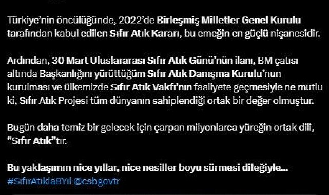 "Türkiye'nin öncülüğünde 2022'de Birleşmiş Milletler Genel Kurulu tarafından kabul edilen Sıfır Atık kararı, bu emeğin en güçlü nişanesidir. Ardından 30 Mart Uluslararası Sıfır Atık Günü'nün ilanı, BM çatısı altında Başkanlığını yürüttüğüm Sıfır Atık Danışma Kurulunun kurulması ve ülkemizde Sıfır Atık Vakfının faaliyete geçmesiyle ne mutlu ki Sıfır Atık projesi, tüm dünyanın sahiplendiği ortak bir değer olmuştur. Bugün daha temiz bir gelecek için çarpan milyonlarca yüreğin ortak dili 'Sıfır Atık'tır. Bu yaklaşımın nice yıllar, nice nesiller boyu sürmesi dileğiyle"