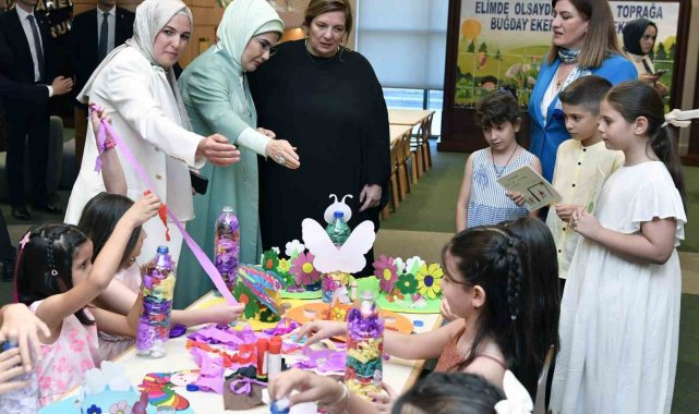 Çocuklar da atık kağıtlardan ve plastiklerden yaptıkları bazı eserler hakkında bilgiler vererek, Emine Erdoğan ile Bagrationi'ye hediye etti.