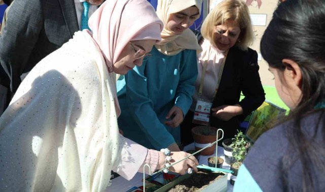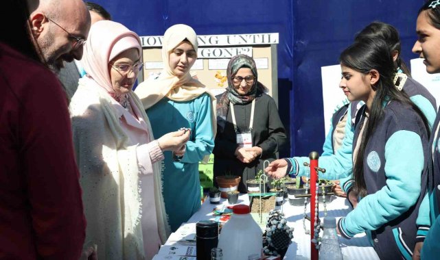 Öğrencilerin Sıfır Atık Projesi kapsamında hazırladıkları el emeği ürünlerin yer aldığı sergiyi gezen Emine Erdoğan, bu çalışmalar hakkında öğrencilerden bilgi aldı.