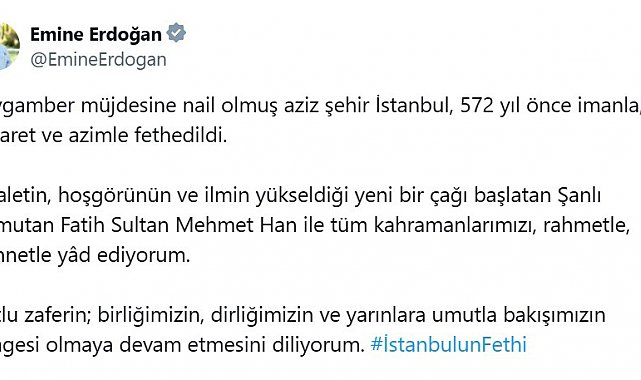 Emine Erdoğan, sosyal medya hesabından yaptığı paylaşımda, "Peygamber müjdesine nail olmuş aziz şehir İstanbul, 572 yıl önce imanla, cesaret ve azimle fethedildi. Adaletin, hoşgörünün ve ilmin yükseldiği yeni bir çağı başlatan şanlı Komutan Fatih Sultan Mehmet Han ile tüm kahramanlarımızı rahmetle, minnetle yâd ediyorum. Kutlu zaferin birliğimizin, dirliğimizin ve yarınlara umutla bakışımızın simgesi olmaya devam etmesini diliyorum" ifadelerini kullandı.
