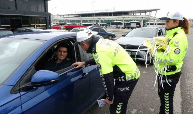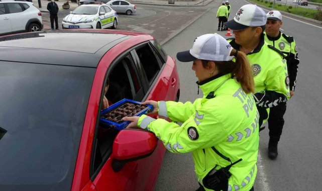 Ordu Çevre Yolu'nda görev alan ekipler, dönüş yoluna geçen sürücü ve yolculara dikkatli olmaları konusunda bilgilendirmelerde bulunurken, çikolata ikram ederek, trafik kuralları hakkında bilgilendirmelerde bulundu.
