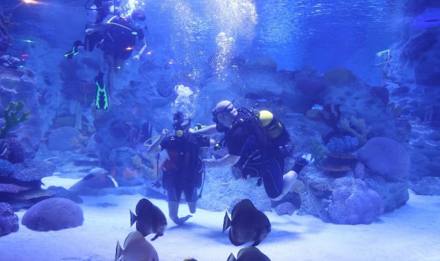 Dünya Engelliler Günü sebebiyle gerçekleştirilen etkinlikte Bağcılar Belediyesi Engelliler Sarayı kursiyerleri bir akvaryumda tüplü dalış yaptı. Su altında bröve takdimi yapılan engelli dalgıçlar, izleyenlerden büyük alkış aldı.